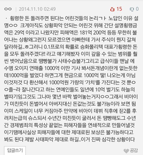 밑에 댓글들 보소 . 글지우라고 시발시발 거리네 ㅋㅋㅋㅋㅋㅋㅋㅋ 그냥 있는 그대로 사실을 쓴건데 지들오빠한테 피해갈까봐 ㅉ 니들이 그러는게 더 욕먹이는거다 걍 가만히 있으면될껄