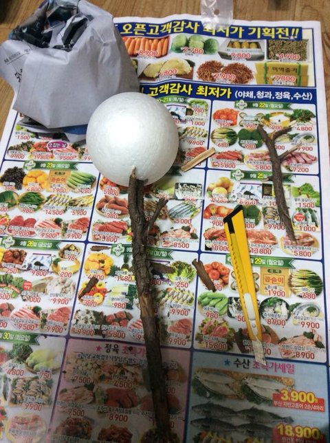 1. 먼저 스티로폼 볼에 구멍을 뚫고 나무를 쑤셔넣습니다.