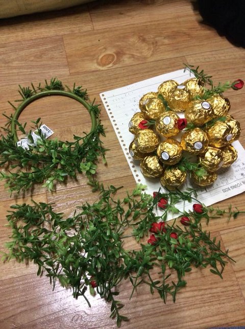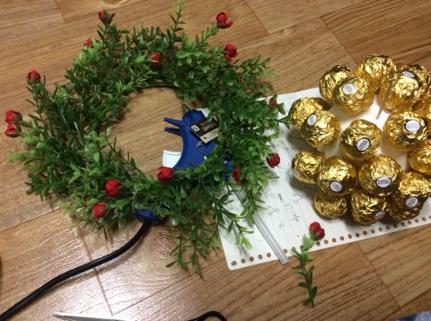 ㄷㅇㅅ에서 조화가 많이 달린 놈을 찾았음 원래 어디에 쓰는건진 모름가위로 다 잘라낸 후에 붙임구멍을 뚫고 구멍마다 줄기 하나씩 넣으려 했지만 너무 힘들 것 같아서그냥 로쉐 사이에 넣고 글루건으로 쏨