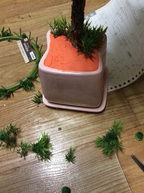 지점토로 고정시키려 했는데 트리 윗부분의 무게가 무거워서 뭔가 더 무거운 것을 채워야 할 것 같았음