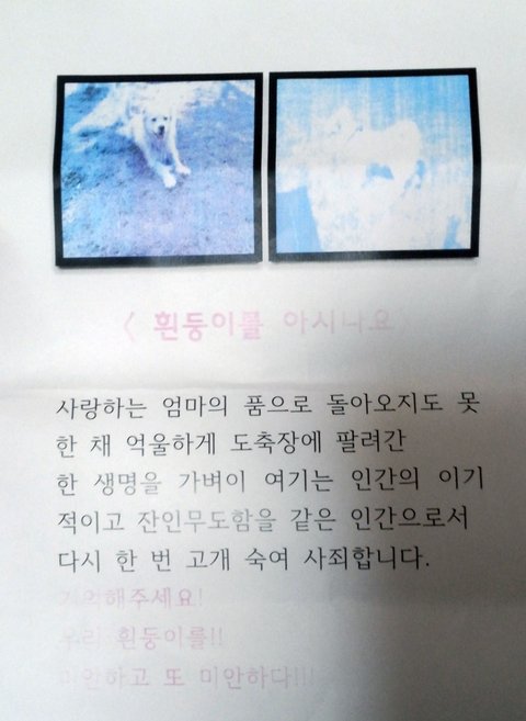 어느 날 흰둥이가 이틀 동안 보이지 않아 아주머니께 전화를 하니 인간으로서 해서는 안 될 거짓말만 늘어놓았습니다.(총에 맞아서 어쩔 수 없이 안락사를 시켰다고 하더군요.)
