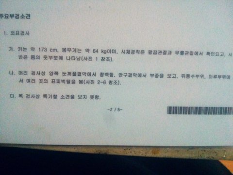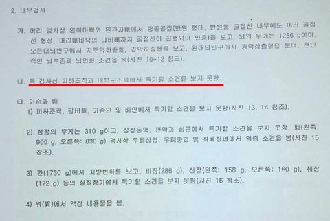 (부검 감정서의 사인은 포괄적으로 두부손상으로 판단 됐지만, 고대병원 사망 진단서의 직접사인은 뇌연수 마비 라고 한다.)