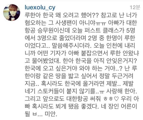 오늘 루한 한국오려다 도중 취소함(인스타 참고)