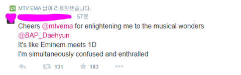 대강 해석하자면 엠티비 방송 보고 비에이피 입덕하신듯ㅋㅋㅋㅋ좀 실례지만 저분 계정 가보니까 원래 5sos 킬러즈 이런 밴드들 파는 분이셨던듯. 와 근데 그 짧은 뮤비를 보고! 감사할따름이다