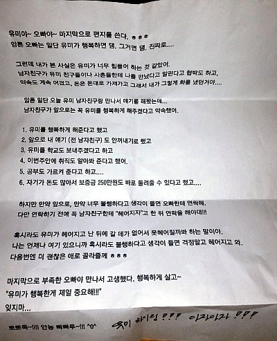 이렇게 쪽지를 보내었는데요. 위 사진의 내용은 유부남 본인 자신의 생각을 적은 것입니다. 일단 돈을 가져간 없습니다. 저랑 여친이 돈쓸 일이 있었는데 500만원 반반 부담했을뿐 제가 전혀 가져가지 않았습니다. 반반 부담 한 것을 유부남은 제가 돈을 가져갔다고 합니다. 그리고 제가 협박을 했다고 하는데요 정확한 상황을 말씀드리겠습니다. 헤어진 직후 여친이랑 연락이 안되서 여친 어머니를 찾아갔습니다. 어디갔는지 도움을 구하고자 했고 어머니는 선뜻 손을 들어주셨습니다. 그러던 찰나에 여친 집으로 전화 오더군요 그사람(유부남) 전화로요, 그래서 딱 알았습니다. 유부남 집에 갔다는 것을. 솔직히 전 여친이 저랑 헤어지더라고 그 유부남이랑 만나는거 여친의 인생을 위해 정말 반대했습니다. 누가 보아도 유부남은 여친의 몸때문에 만나는 것이기 때문입니다.과거에 유부남이랑 여친이 만나는 날은 항상 성관계를 가졌고 소정의 용돈도 가끔 준다고 합니다. 데이트 다운 데이트는 한번도 못해보고 항상 만남을 갖는곳은 모텔이나 그사람 사무실이라고 합니다. (고1겨울 ~24살 까지요,약 5~6년) 그래서 전 어떤 수를 써서라도 그사람을 만나는 것을 막고자 어머니에게 사실대로 이야기를 했습니다. 여친도 그것에서 벗어 나고 싶지만 자신을 이끌어줄 사람이 없었다고 합니다. 그래서 여친을 거기서 빼내와야 했던 것이고 어머니가 큰아빠에게 이른다는둥 말을 하였고 저역시 너 거기서 지금 안나오면 사촌들 다 알거라고 말을 했었습니다.