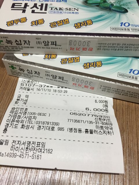 병원 밑 약국에서 탁센 구매 하나에 4500원라고 2개에 9000원에 구입 홈플러스 물건 사러 갔다가 약국 있길래 가격 물어보니 3000원