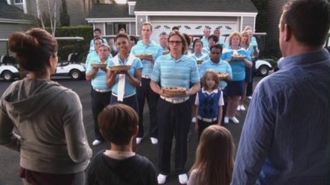 모두가 똑 같은 골프 의상을 입고, 피라미드 대열을 이루는데요.