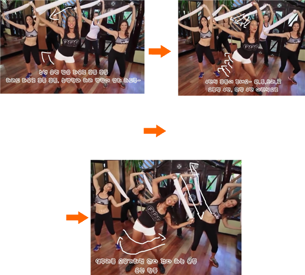 수건을 잡고 팔을 쭉 핀 다음, 오른쪽으로 4번, 왼쪽으로 4번 팔과 다리 방향이 같게 반복해 주면 됩니다~