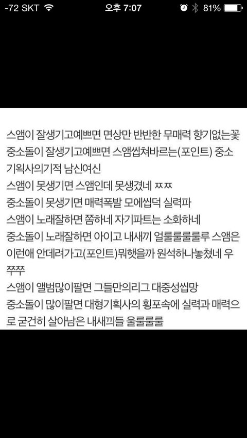 ㄹㅇ대형기획사 까는 사람들 보면 대부분 중소기획사 아이돌 팬;