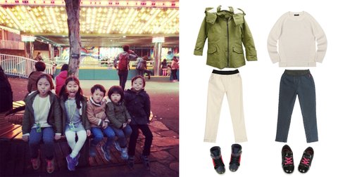 또한 각자 개성있는 표정과 함께 삼윤이의 트레이드 마크 ‘트윈스룩’으로 놀이동산 스타일링을 완성했다. 삼윤이는 퍼 디테일 카키 야상점퍼에 롱 니트, 그리고 데님, 져지 레깅스를 매치하여 편안하면서도 스타일리시한 놀이동산 스타일링을 선보였다.