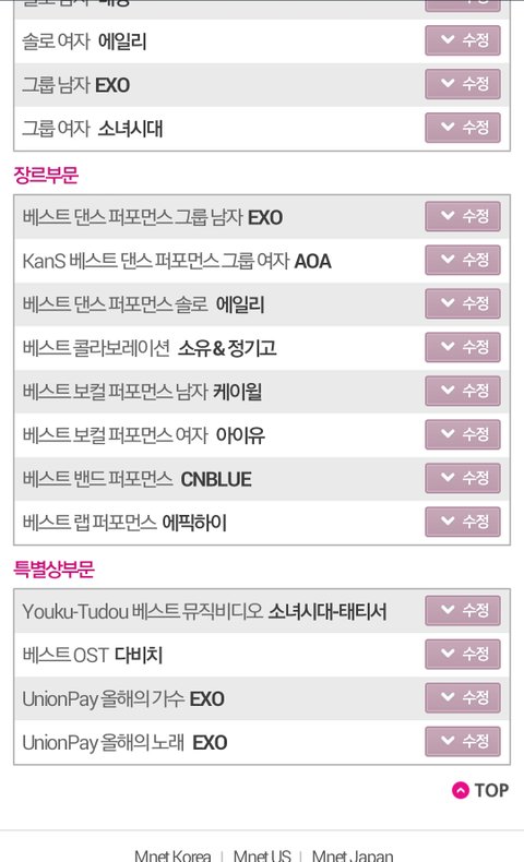 사실 전 샤월이거든요...오늘 멜론뮤직어워드를 잠깐 봤는데 스엠가수분들이 아무도 안나왔더라구요ㅠㅠ 지난년도 저희애들이랑 엑소분들 같이 대상받아서 엔딩장식한것도 생각나고...ㅋㅋ여러모로 씁쓸하기도하고 마마에서는 스엠가수분들이 기를 펴고 좋은상 많이 받았으면 좋겠네요. 물론 우리애들은 이번에 시상식 참여 안하지만 지난년도 영광을 엑소분들은 다시 느끼길 기원하면서 투표합니다.