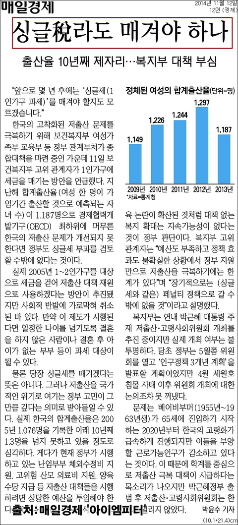 때아닌 싱글세 논란이 불거지고 있습니다. 11월 12일 자 매일경제 신문 12면에 '싱글세라도 매겨야 하나'라는 기사에서 시작된 싱글세 논란은 실시간 검색어 1위에 올랐고, SNS에서는 온종일 싱글세 비판이 끊이지 않았습니다.