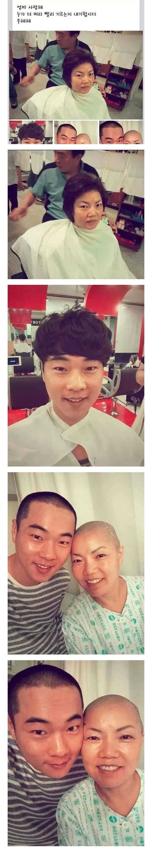 와 보자마자 울컥했습니다 저희 엄마께서도 3개월 시한부선고받고 수술도어려워 생명연장 목적으로..항암치료30번 가까이 받으셨는데 그때 다닌 자리마다 머리카락이 한웅큼빠져있어서 결국 머리미셨어요 동생이나 저나 어리다면 어렸을 나이라 저희 속상해할까봐 삭발한 머리 만지시며 눈물이 가득 맺혀서는 애써 웃으시던 엄마를 보며 세 모녀가 부둥켜안고 한참을 울었었는데ㅠㅜ.. 진심 !!너무 아름답고 멋진 사진입니다 지금은 완쾌 판정받고 우리가족 곁을 지켜주시고 있는 엄마 ..사랑합니다♥♥저 분도 완쾌하시기를 간절히 기도합니다!!!!