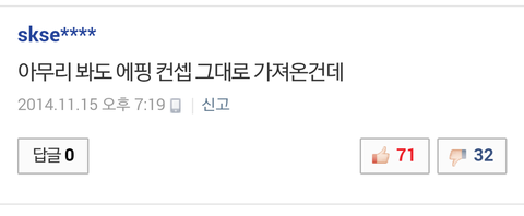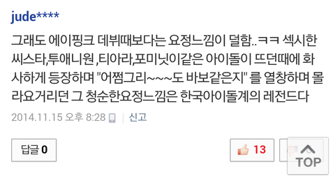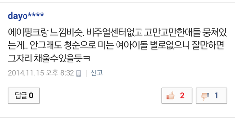 저기요 섹시컨셉하면 야하다고 욕할거잖아요;; 그래서 곱게 청순컨셉들고 기어나오면 왜 에이핑크따라하냐는 소리가 나오냐구요ㅋㅋㅋㅋ병맛? 오캬나 크레용팝따라했다할거지?ㅋㅋㅋㅋㅋ이야...어떡하냐...