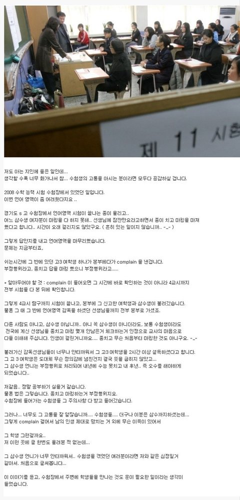 그러면 부정행위처리될까봐 시간내에 부랴부랴 마킹한사람들은 어쩌라는거죠?시간내에 마킹끝내는게 원칙이잖아요. 저는 저 고3여학생 입장이 이해가 되는데요;안타깝긴하지만 삼수생이라고 봐주는건아니죠;