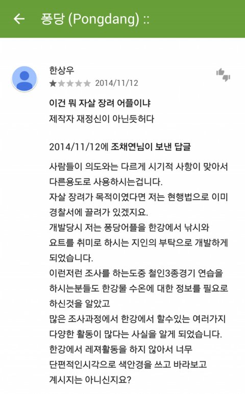 나만 좀 그런가..? 어플 개발자는 좋은 의도로 만들어서 좋지만 리뷰 남기는 사람들이 아무리 장난이라도 일부러 자살하러 간다는 식의 말만 거의 남기니까 마음이 좀 그렇다.. 내가 너무 진지하게 생각하나