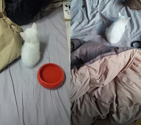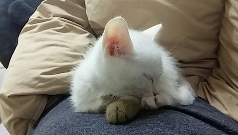 생후 45일 정도 된 상태로, 형제로 추정되는 아이들과 함께 근처 동물병원으로 구조되었는데, 입양할 사람이 나타나지 않는다면 안락사 될 예정이라길래, 일단 임시보호를 위해 한 마리라도 무작정 데려왔다고 하네요. 이름은 “쮸”입니다. (나중에 알아보니, 다행히 안락사시키지는 않고 중성화 후 방생한다고 하네요.)
