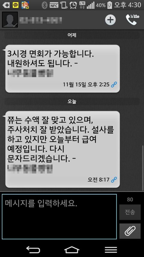 어제는 병원 휴무일이라 내원하지는 못했지만, 원장님께서 직접 돌봐주시고 계신다고 합니다.)