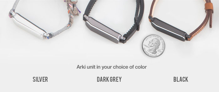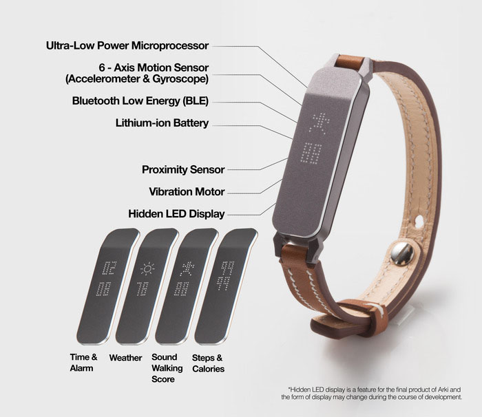Arki에는 6축 동작 센서와 저전력 블루투스, 근접 센서, 진동 모터, 숨겨진 LED 디스플레이가 들어가 있다. 배터리는 5일간 사용할 수 있으며 방수 기능과 교체형 손목줄은 기본이다.