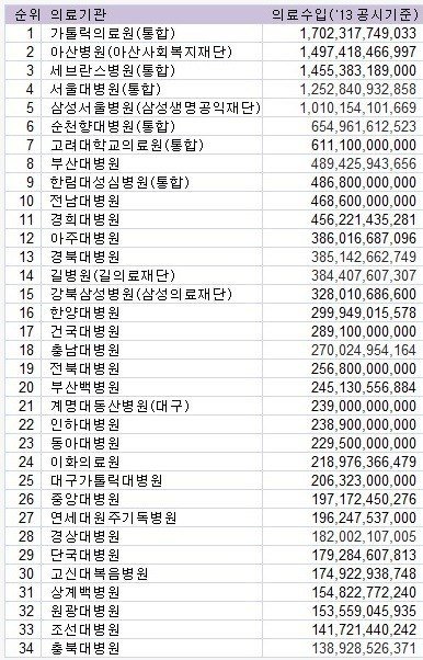 2013년 대학병원 의료 수입 순위