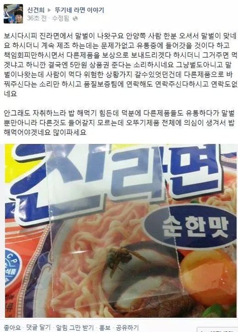 라면속에 벌레가잇어도 유통중에 생긴거면 소비자고발도 안되나봄 그냥 더러운제품 피해가야될듯싶네요 벌침 맞아봐야 정신차릴려나