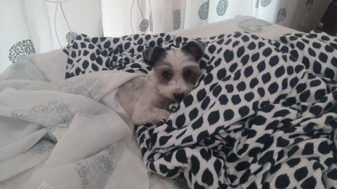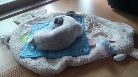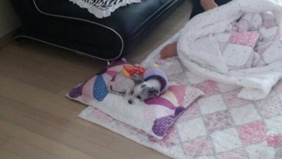 이불에는 올라와야겠고, 어쩔수없이 조금 거리를 두고 눕는 밍키.ㅎㅎㅎ