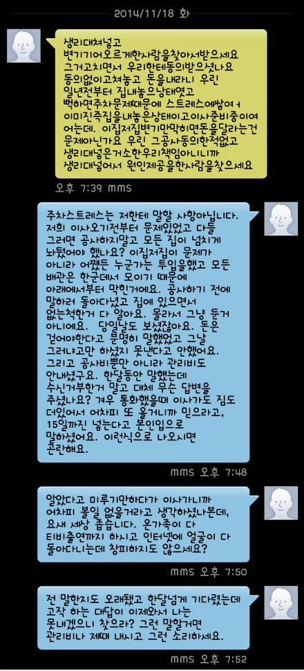 그러다 겨우 아줌마랑 통화가 됬는데 자기는 지금 돈이 없어서 못주고 받을 돈이 있으니 11월 15일까진 준다고. 그리고 이사하더라도 한번에 짐 빼는게 아니라 또 왔다갔다 할꺼니 믿으라며..