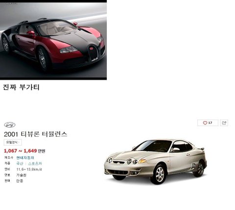 부가티 베이론은 세계에서 가장 좋은 차종이구요. 기본가격만 해도 국내로 들어 올 시 30억이상입니다. 11년도에 우리나라 정식등록 된 부가티는 3대에 그칩니다. (이건희회장이 1대가지고있음). 그렇기에 중고차로 매물이 없죠... 그치만 저기 부가티 짭탱 (일명 : 현대 티뷰론 터블런스 1998년식) 은 중고가 250만원에 매매 되고있습니다. 터블런스 사고 부가티처럼 꾸며논겁니다. 약 1200배의 가격차이네욬??ㅋㅋㅋㅋㅋㅋㅋㅋㅋㅋㅋㅋㅋㅋㅋㅋㅋㅋㅋㅋㅋㅋㅋㅋㅋㅋㅋㅋㅋㅋㅋㅋㅋㅋㅋㅋㅋㅋㅋㅋㅋㅋㅋ미친ㅋㅋㅋㅋㅋㅋㅋㅋㅋㅋㅋㅋㅋㅋㅋㅋㅋㅋㅋㅋㅋㅋㅋㅋㅋㅋㅋㅋㅋㅋㅋㅋㅋㅋㅋㅋㅋㅋㅋㅋㅋㅋㅋㅋㅋㅋㅋㅋㅋㅋㅋㅋㅋㅋㅋㅋㅋㅋㅋㅋㅋㅋㅋㅋㅋㅋㅋㅋㅋㅋㅋㅋㅋㅋㅋㅋㅋㅋ여친개웃겨