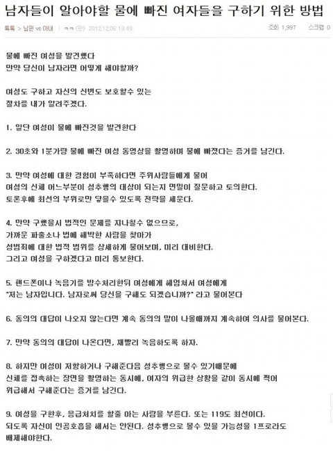 흠...베플좀 충격이다 ㅋㅋㅋㅋ나만그런거냐ㅋㅋㅋ 난구해줄건데 여자고나발이고 물에빠진사람보면 구해줘야겠다는 생각이드는건 당연한거아니냐? 어쩌다가 이렇게된거임? 물에빠진 여자들 소수가 또라이같으니까 기사화되서 많은것처럼보이는거지 실제로 안그러지않나? 진짜 무섭다 ;;; 아니 진심으로 못구해주는게 아니라 안구해준다고? 대단하네
