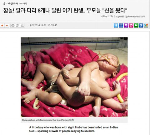 부모랑 지인이란것들 미친거 아님? 쌍둥이가 되려고 했던 배아가 세포분열 잘못해서 쌍둥이가 되지 못하고 한 몸체에 팔다리만 더 붙어버린거 같은데 살수는 있는거야? 그나저나 저기는 기형아검사나 초음파 한번도 안 보는 낙후지역인가