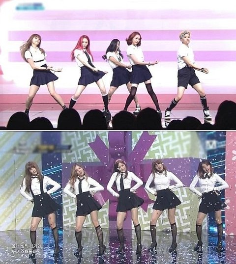 프레피룩과 함께 교복에 잘 사용하지 않는 액세서리를 믹스 매치해 그룹 특성에 맞는 독특한 패션을 완성했다. 하지만 채 1년도 되지 않은 시점에서 에이핑크가 이를 그대로 모방해 무대에 오른 것이다. 의상 스타일과 독특한 액세서리, 옷의 패턴까지 똑같았지만 에이핑크 측은 ‘표절’ 논란에 침묵했다.