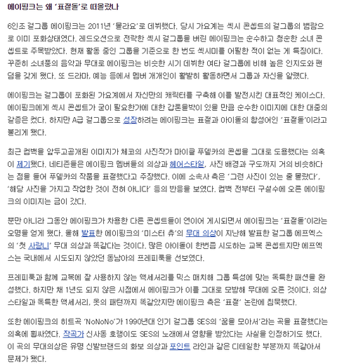 에이핑크는 걸그룹이 포화된 가요계에서 자신만의 캐릭터를 구축해 이를 발전시킨 대표적인 케이스다. 에이핑크에게 섹시 콘셉트가 굳이 필요한가에 대한 갑론을박이 있을 만큼 순수한 이미지에 대한 대중의 갈증은 컸다. 하지만 A급 걸그룹으로 성장하려는 에이핑크는 표절과 아이돌의 합성어인 ‘표절돌’이라고 불리게 됐다.