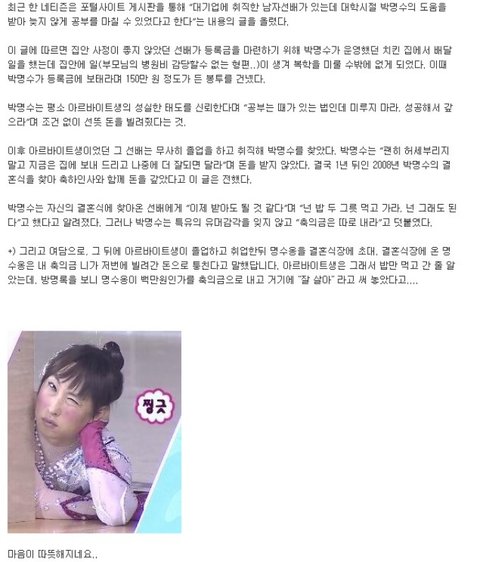 명수옹 예전에도 남몰래 기부한거 기사에 나왔었는데 그 기부금 받은 쪽에서 한 말이 자기가 기부한 사실 말하지안았으면 좋겠다고 했다고.. 명수옹 ㅠㅠ 어렸을때 아픔이 있어서 그런지 자기는 남을 참 잘 배려하고 이해해주는 모습 좋아요 오래 오래 건강하세요 명수옹