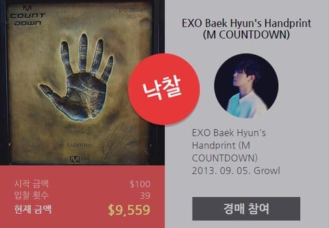 최고가 9256달러였는데 마감 2초 전에 9559달러 배팅한 분에게 낙찰됐어백현이 생일금액으로 낙찰 되었어도 의미 있고 좋았겠지만 마지막 눈치 작전 하신 분 금액도 좋으네오구오구 우리 백현이 핸드프린팅 낙찰 금액으로 좋은 일에 쓰인다니 기분 좋다 'ㅅ'