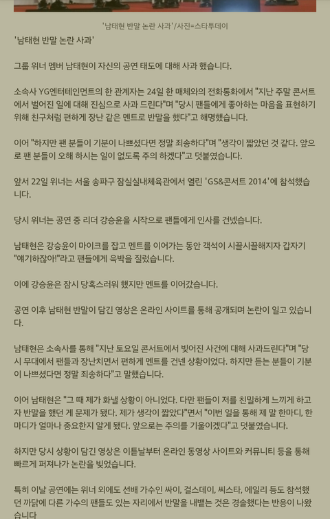 남태현이 일진이고 뭐고 관심없는데 이번엔 남태현이 잘못했네 어디서 신인주제에 선배들앞에서 이런말을할수가 ㅋㅋ 그냥 얘기하잖아요... 이것도 아니고 얘기하잖아! 이거야 ㅋㅋㅋ 아 존 나웃기네 ㅋㅋㅋ