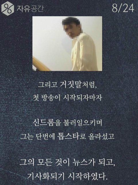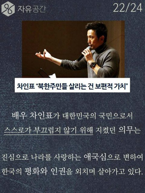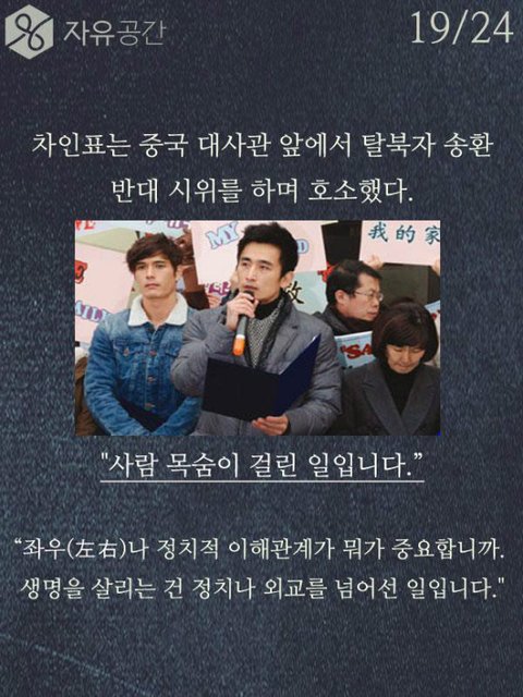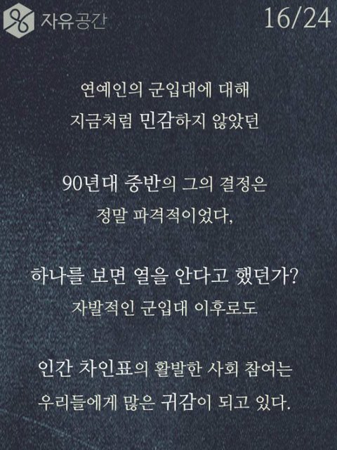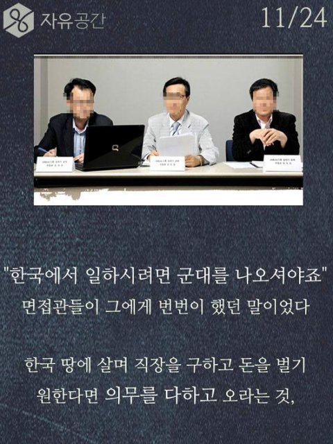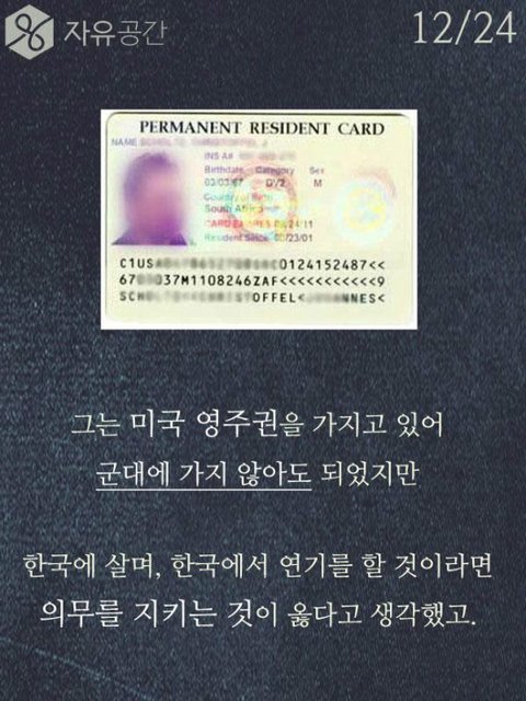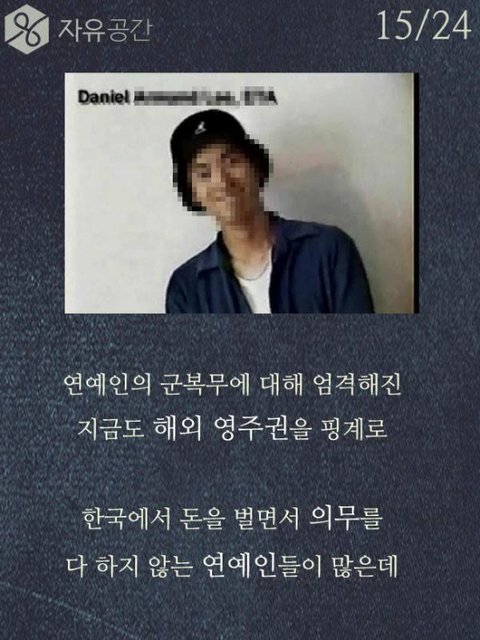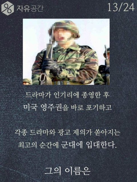 차인표씨 훌륭한거 인정합니다. 근데 저기 위에 모자쓴사람 타블로 같은데 타블로 국적이 미국이고 한국에서 돈을 벌던 미국에서 돈을 벌던 타블로는 군대를 갈 의무가 없습니다. 차인표씨가 간거는 진짜 존경할 만한거지만, 그렇다고 다른 국적으로 우리나라에서 돈을 버는사람이 군대를 안간다는 이유만으로 욕하고 저렇게 사진을 올릴 자격이 없다고 생각합니다. 예를 들어 싸이가 미국에서 꾸준히 돈을 벌고 거기서 생활을 한다는 이유만으로 미국 군대를 안가서 욕을 먹는다고 생각해보세요. 예를 든게 어이없겠지만 타블로가 그리고 그외 다른 국적을 가진 사람이 군대를 가건 안가건 그들의 자유고 우리가 비판할 이유가 없습니다. 그건 국가가 선택해야 하는거고 국가가 가라고 하지 않는이상 그건 그들의 선택입니다.