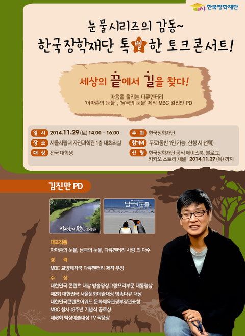한국장학재단에서 MBC 김진만PD님의 '톡별한톡' 토크콘서트를 엽니다.