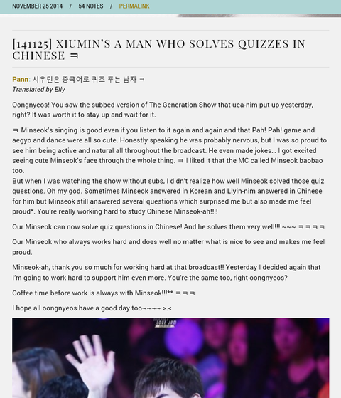 나 지금 민석이 소식이 궁금해서 컴으로 초록창 실시간검색글들 확인하고 있었는데 낯이 익은 글 제목이 보이더라구. 시우민은 중국어로 퀴즈푸는 남자라고. 이거 내가 써서 베톡이 되었던 글이거든. 누가 이렇게 나랑 똑같은 내용으로 글을 썼을까 궁금해서 클릭해 봤더니 글 내용이랑 짤 배치가 내가 한 그대로... 글 출처는... 시우민판? 헐... 그러니까 내 글을 번역해서 올린 거였어. 웅녀들 다 알고 있었어? 나는 신문물에 빠른 사람이 아니라서 전혀 몰랐어. 생각도 못해봐서 신기하기도 하고, 앞으로는 글 쓸 때 더 신경써야 겠다 싶기도 하고 그러네. 시우민톡에 글 올리면 사람들이 그대로 다 믿는다고 어떤 웅녀가 쓴 글 본적이 있긴 한데... 암튼 이쁜 민석이 생각하면서 웅녀들 모두 민석이 응원 많이 하고 우리 톡도 이쁘게 잘 이어가자구. 혹시 문제 있으며 글삭할 테니까 살짝 알려주고.....