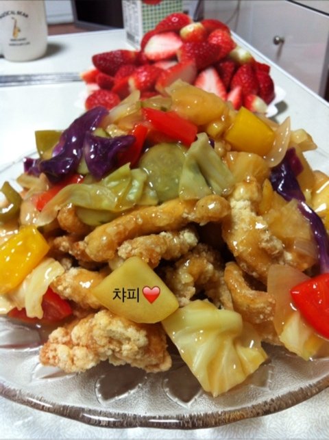 돼지누린내에 좀 민감한 편이라 닭가슴살을 전분가루로 튀겨 먹었더니