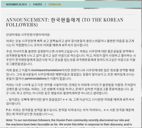 추신:밑에 다른 웅녀가 쓴 댓글을 이 곳으로 옮겨왔어요. // 한 웅녀의 걱정하는 댓글을 보고나서, xiuminpanntranslations 운영자님께 말씀드리고 싶은 게 생겼습니다. 이제는 xiuminpanntranslations블로그가 시우민판의 글이 번역되는 곳이라는 사실이 알려지게 되었습니다. 그래서 혹시라도 나쁜 행동을 하는 사람이 그 곳을 찾아가지 않을까 걱정이 되네요. 시우민이 한국에서 큰 사랑을 받는다는 것을 질투하는 사람들도 있거든요. 만약에 그들이 웅녀인척, 시우민팬인척 하면서 예의없는 댓글을 쓰거나 나쁜 행동을 한다면 단호하게 대처해주세요. 그리고 진짜 시우민팬들의 도움이 필요하시면 이곳으로 알려주십시오. 화이팅입니다!!