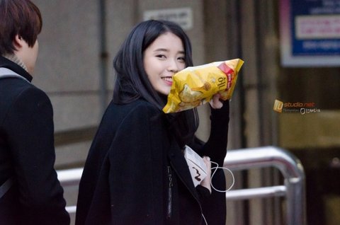 요즘 없어서 못 판다는 그 허*버터* 과자 들고 출근하는 아이유 ㅋㅋ
