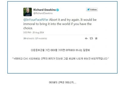 와 여기댓글들 진짜웃긴다. 당신들이뭔데 장애인들의 삶이 불행할거라고 단정짓는거지? 저들의 삶을 끝내네 마네 판단할수있는 사람은 설사 부모라해도 그럴 자격없는거아닌가? 태어나서 정말로 수모를겪고힘들지라도 그건그아이의 운명인거고 그속에서 배우고 성장하고 하는거지 당신들이뭔데 장애인들의 인생에 한계를 긋고 판단질인거야? 지금당신들이 하는 말이 지금 이세상에서 살아다고있는 장애인들에게 어떤말을하는건지 모르나?.. 어떤 생명이든 죽어야마땅한 이유를 가진 생명은없고 축복받지못할 생명도없다. 저딴 개소리로 합리화하면서ㅠ그들의 죽음을 정당화시키지마라. 너네한텐 그럴자격없다.