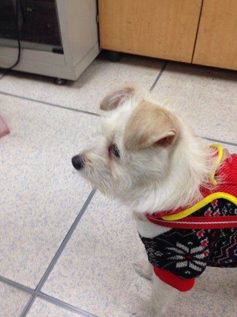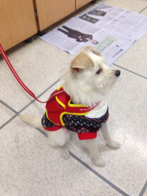 역내를 돌아다니다가 유실물 사무실 직원에게로 인계되어 왔습니다 . 산책을 하다 잃어버리신건지 작은가방을 메고 있고 목줄도 있어요