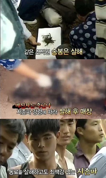 # 두 번째 범행 같은 조직원이였던 송봉은(18세)이 조직을 이탈 하려 했다는 이유로 단검과 곡괭이로 무참히 살해함
