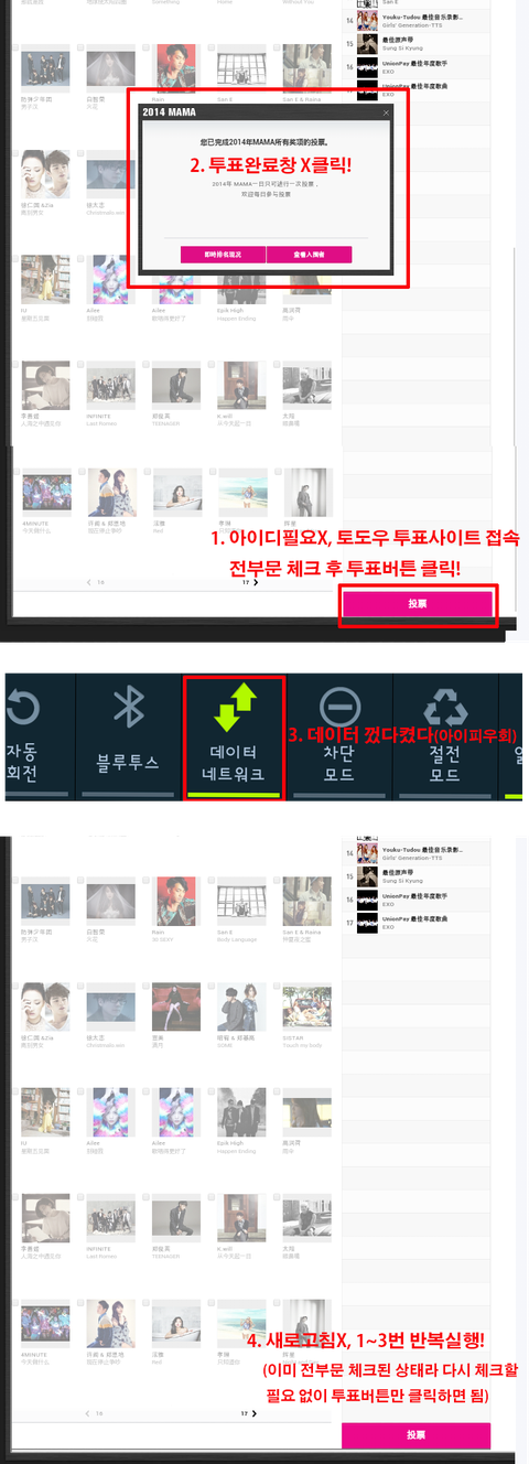 아이디 필요없이 데이터 껐다켰다 하는 방법인데... 1분에 8~10회 투표가능!