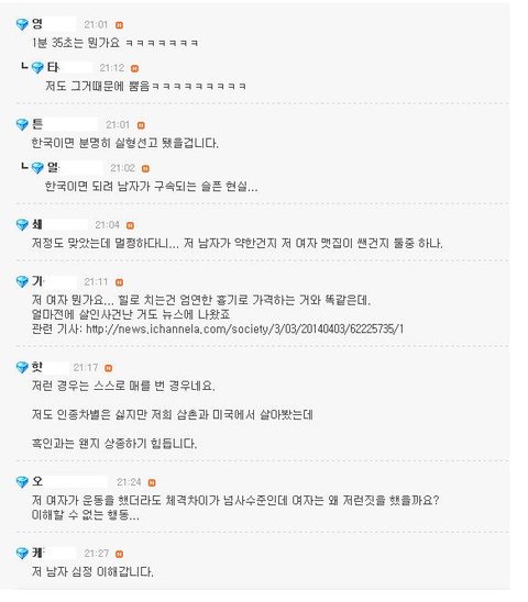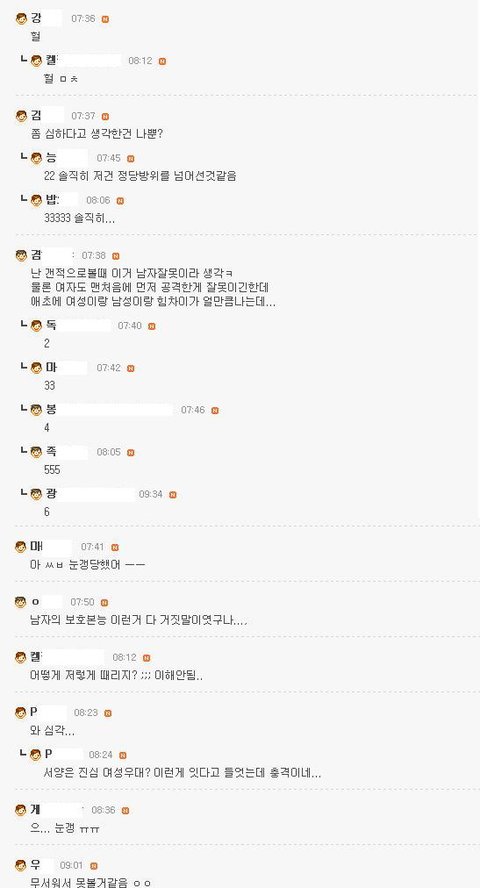 키야~~~~아무리 여자가 그것도 이유없이 시비털어도 남자가 패면 그건 남자가 더 잘못한거야!!! 댓글에 서양은 레이디 퍼스트 사상이 있다던데 깨지니 여무룩 해졌내 ㅋㄱㅋ