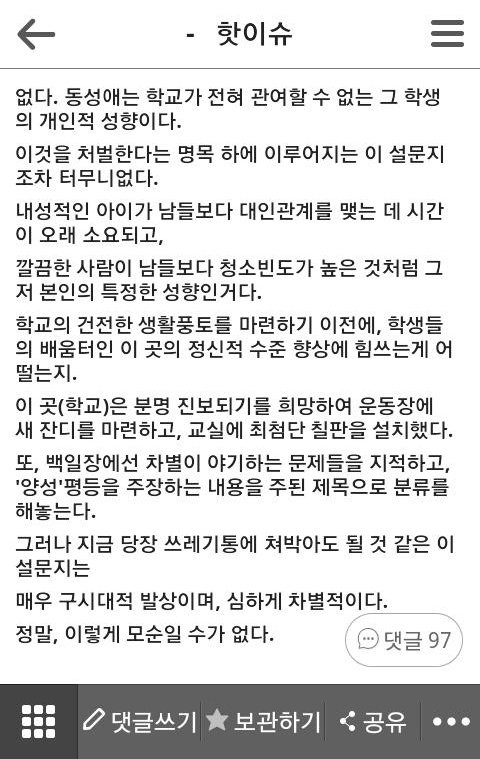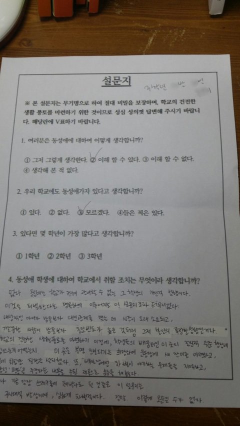 근데 웃긴건 이렇게 설문지를 적어내면 너 동성애자냐? 하는 시선이 현실에 많다는 거. 나 역시 동성애자는 아니지만 동성애를 이해하는 입장인데 나도 사람들 앞에서는 동성애자 이해할수 없다는 식으로 말한적이 있다. 참 이상한게 사람들이 너무 이분법으로 사는것 같다. 세상엔 흑백만 있는게 아닌데 동성애를 옹호하는 발언을 하는 것만으로 동성애자아니냐는 의심을 받는 현실에 마음이 아프고 그런만큼 용감하게 이름까지 써낸 이 16살 아이의 용기가 부럽고 대견하다.