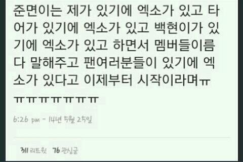 내가 준멘 생일날 햇던 생축 이벤트?같은거 인데 연예인들이랑 친한 아는 언니 한테 이말 좀 준멘한테 전해달라고 했는데 언니한테 후기 좀 들어보니깐 준멘이 감동먹어서 울뻔했다고 했지만 바로 스케줄있어서 안울었다고함