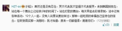 이미 예상했듯이 결국, 난 못 참았어요. 눈물을 흘린다는게 내가 강하지 않다거나, 우는 걸 좋아한다는게 아니에요. 한국에 온 후, 거의 2년동안 많은 무대에 서왔어요. 무대에 서고, 매일 아침마다 리허설을 하거나 연습을 하고, 여러 활동을 하고... 우리 12명 모두, 힘들다거나 포기하고 싶다고 말한 사람은 아무도 없었어요. 함께 열심히 하면서 얻은 행복과 지켜온 신념, 상을 받는다는 말을 들은 순간, 그것들이 정말 모두 가치가 있었다고 깨달았습니다. 모두들 고마워요.
