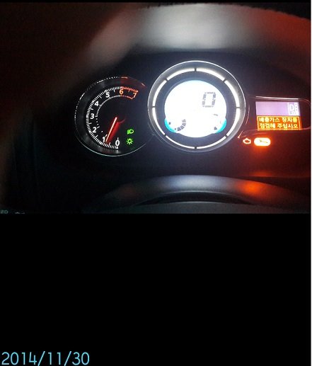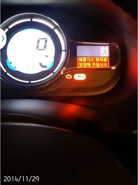 그리고 다음날인 11월 30일 일요일에도 출근하는 저는 비오는 아침이었지만 새차로 출근하려니 기분이 좋았습니다. 하지만. 그것도 잠시, 5km정도를 운행하니 또 다시 어제와 같은 씨뻘건 경고등이 계기판에 떴습니다. 정말 화가 났습니다. 직장까지의 거리가 80km가 다되는데 큰 교통사고를 한번 겪어본 저로서는 가스장치를 점검하라는 경고를 무시하고 운전을 할 엄두는 도저히 안나더군요, 남편에게 차를 맡기고 남편차로 출근을 하였습니다.